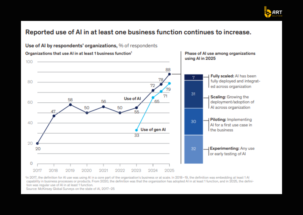By the end of 2026, more than 80% of enterprises are expected to have used generative AI APIs/models or deployed GenAI-enabled apps in production. McKinsey also reports that 88% of companies use AI in at least one business function, but many are in the experimentation phase, not durable, repeatable delivery.