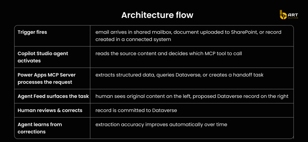 The Power Apps MCP Server connects Copilot Studio agents to the logic and data structures already defined in your model-driven Power Apps and Dynamics 365 environment. The agent receives a trigger such as an incoming email, a document uploaded to SharePoint, a new record in another system, processes the unstructured input, and then uses the MCP Server to interact with your Dataverse tables.